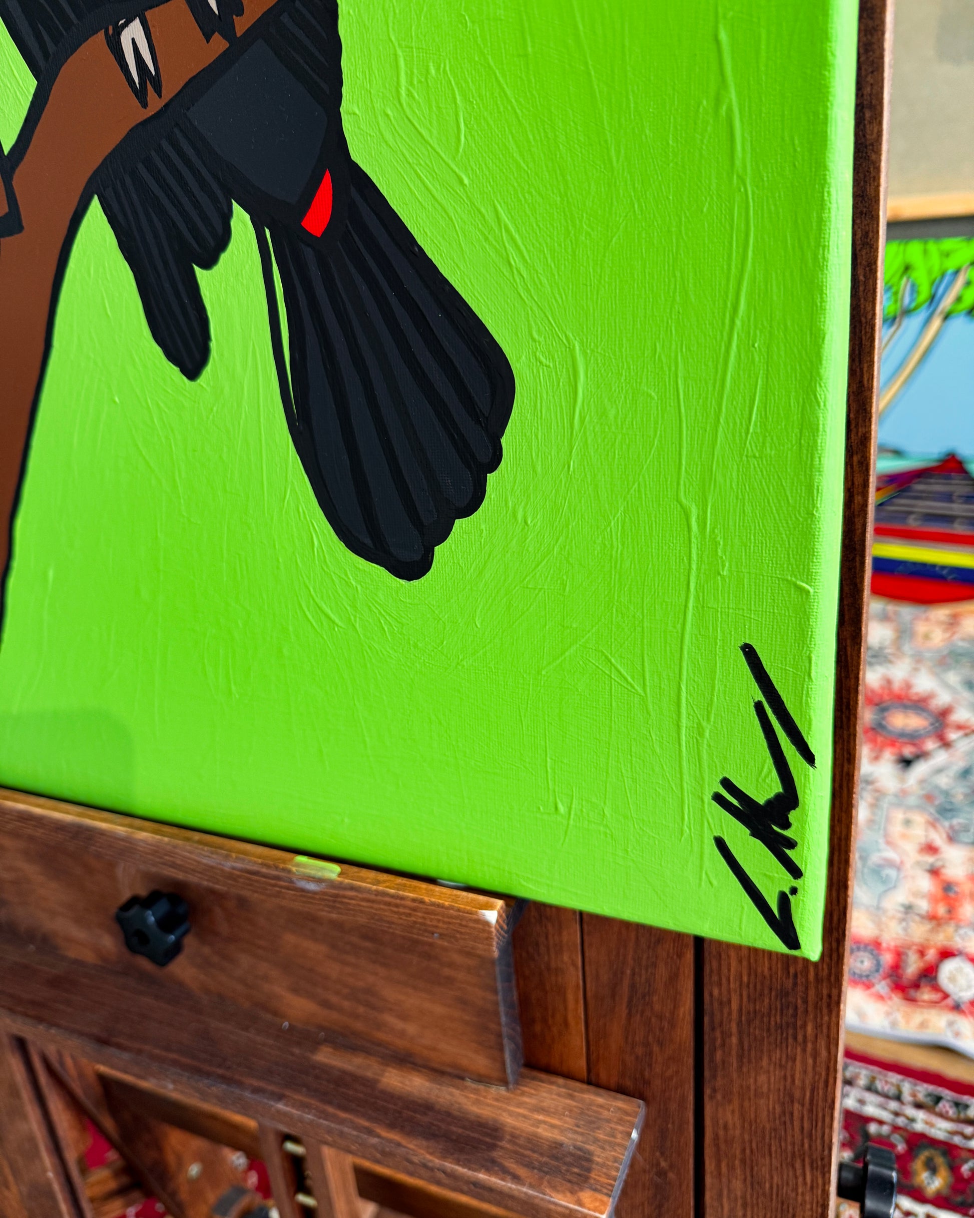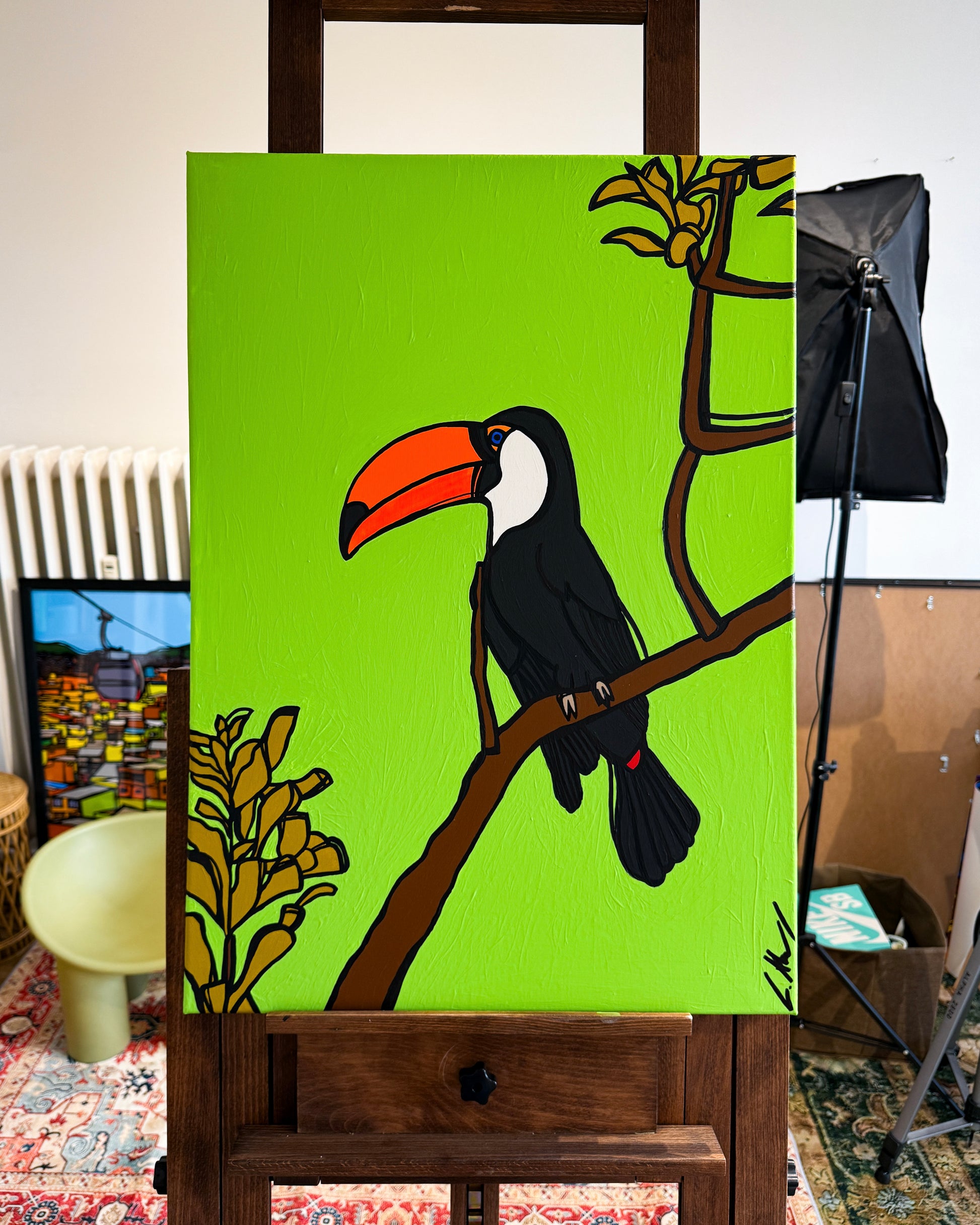 Esta vibrante pintura acrílica de Claudia Ahrens representa un tucán sobre un intenso fondo verde kiwi. El marcado contraste entre el oscuro plumaje del ave y su pico naranja brillante y naranja neón crea una poderosa presencia visual llena de energía y vida.