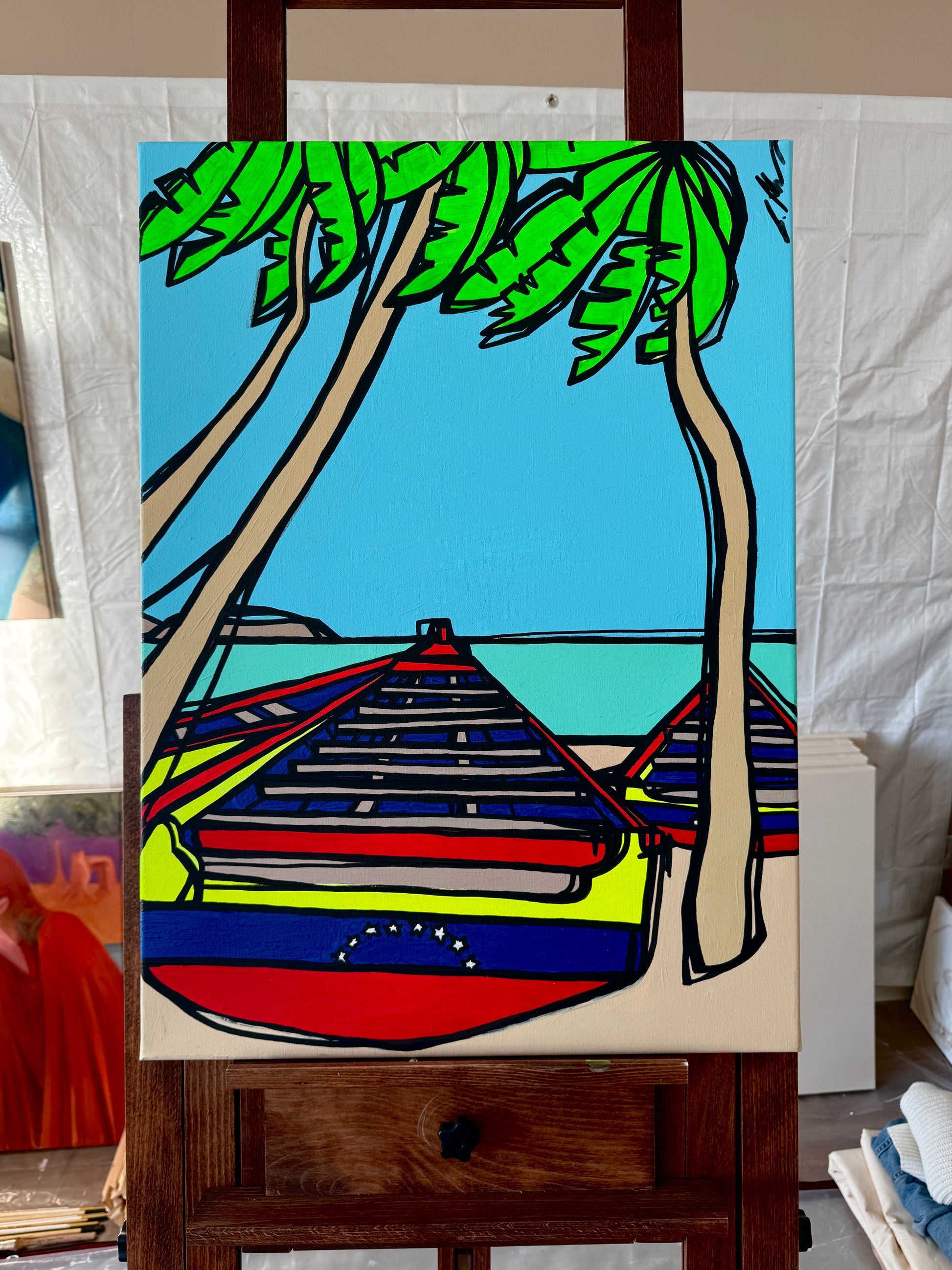 In this work, the painter Claudia Ahrens processes her impressions of Isla Margarita in Venezuela. Using her characteristic, colorful comic-strip style, she deliberately incorporates the yellow, blue, and red colors of the Venezuelan flag. The stars, clearly emphasizing the connection to Venezuela, also appear in the blue area.
