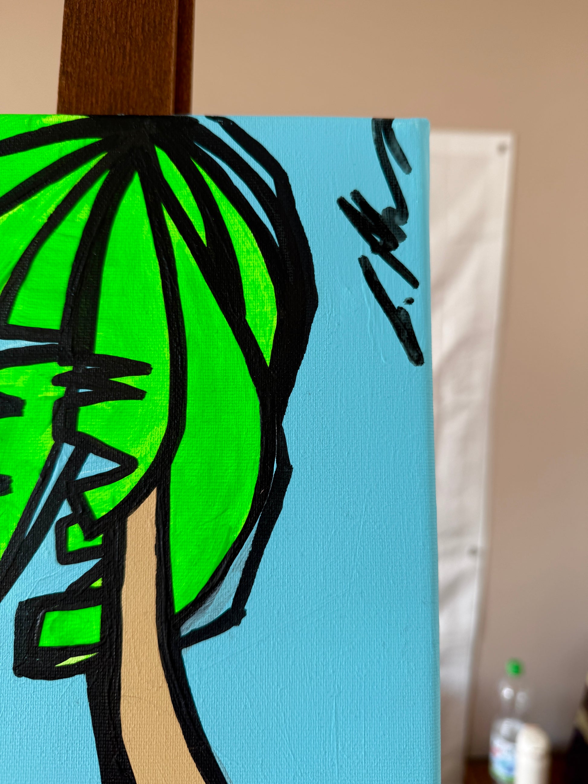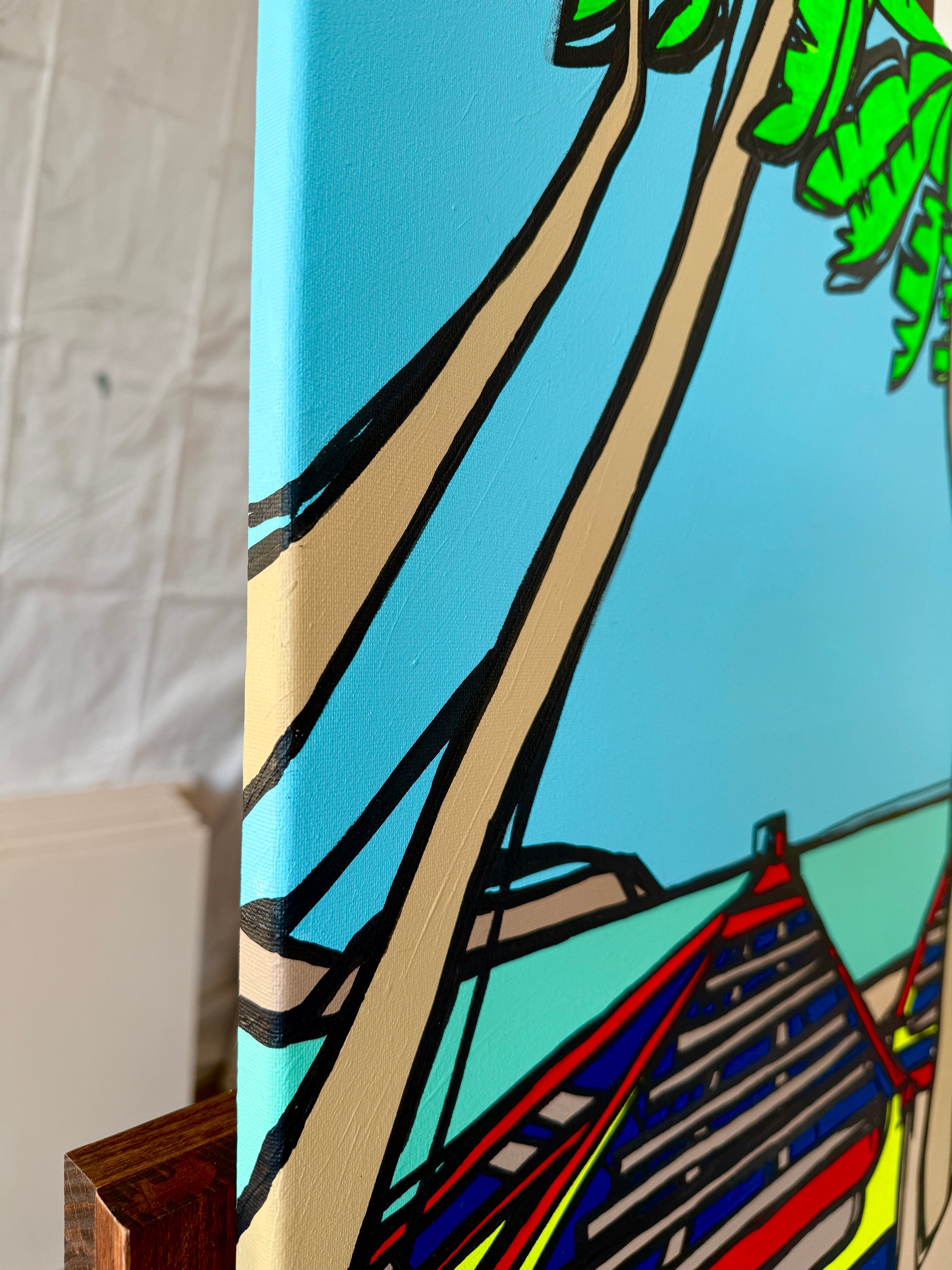 The scene is framed by palm trees with vibrant neon-green leaves, lending the image a strong, lively presence. The sea shimmers in an intense turquoise, conveying tranquility, vastness, and lightness. The painting reflects the island's joyful atmosphere and makes the warmth and openness of its people visible in an emotional and expressive way.