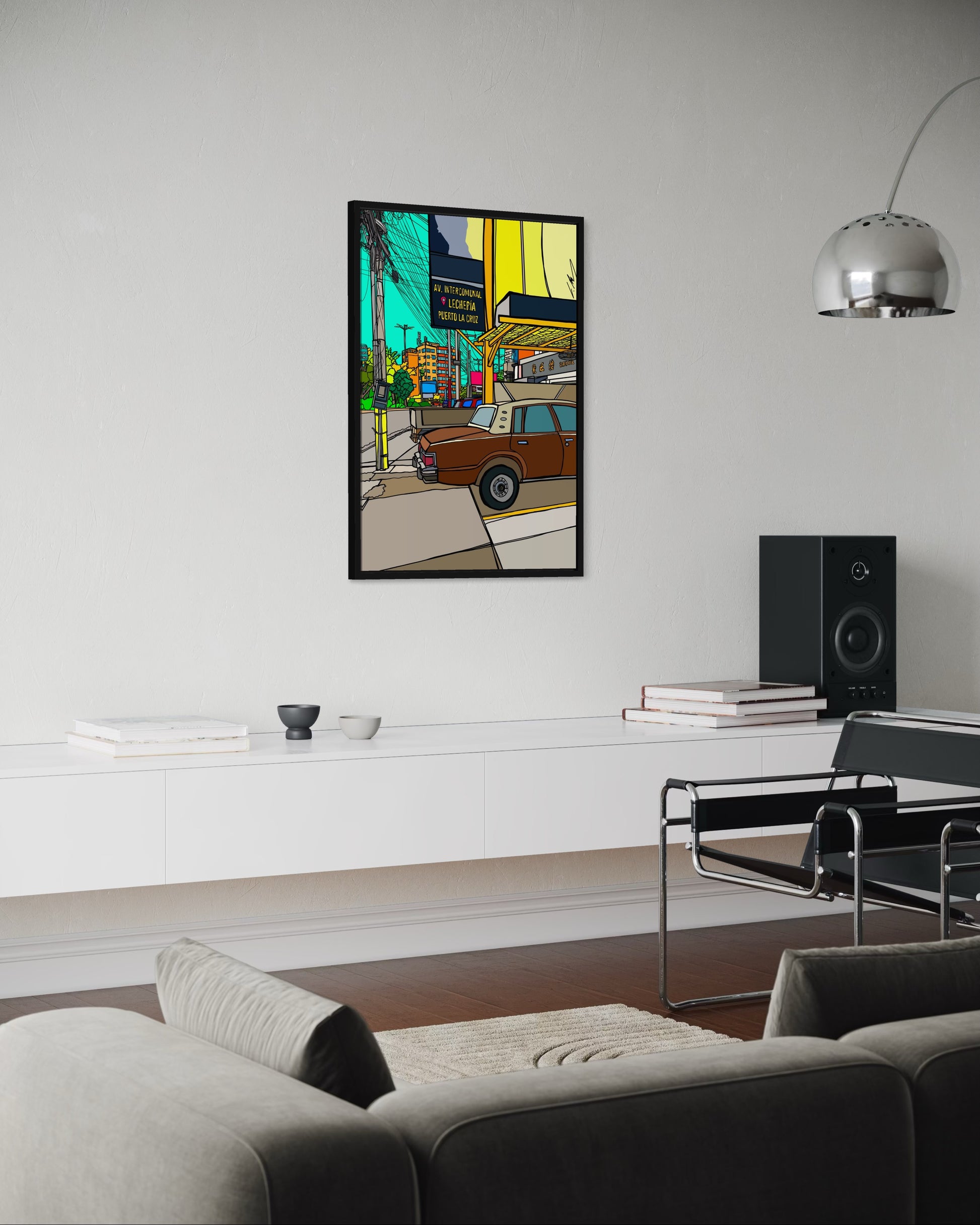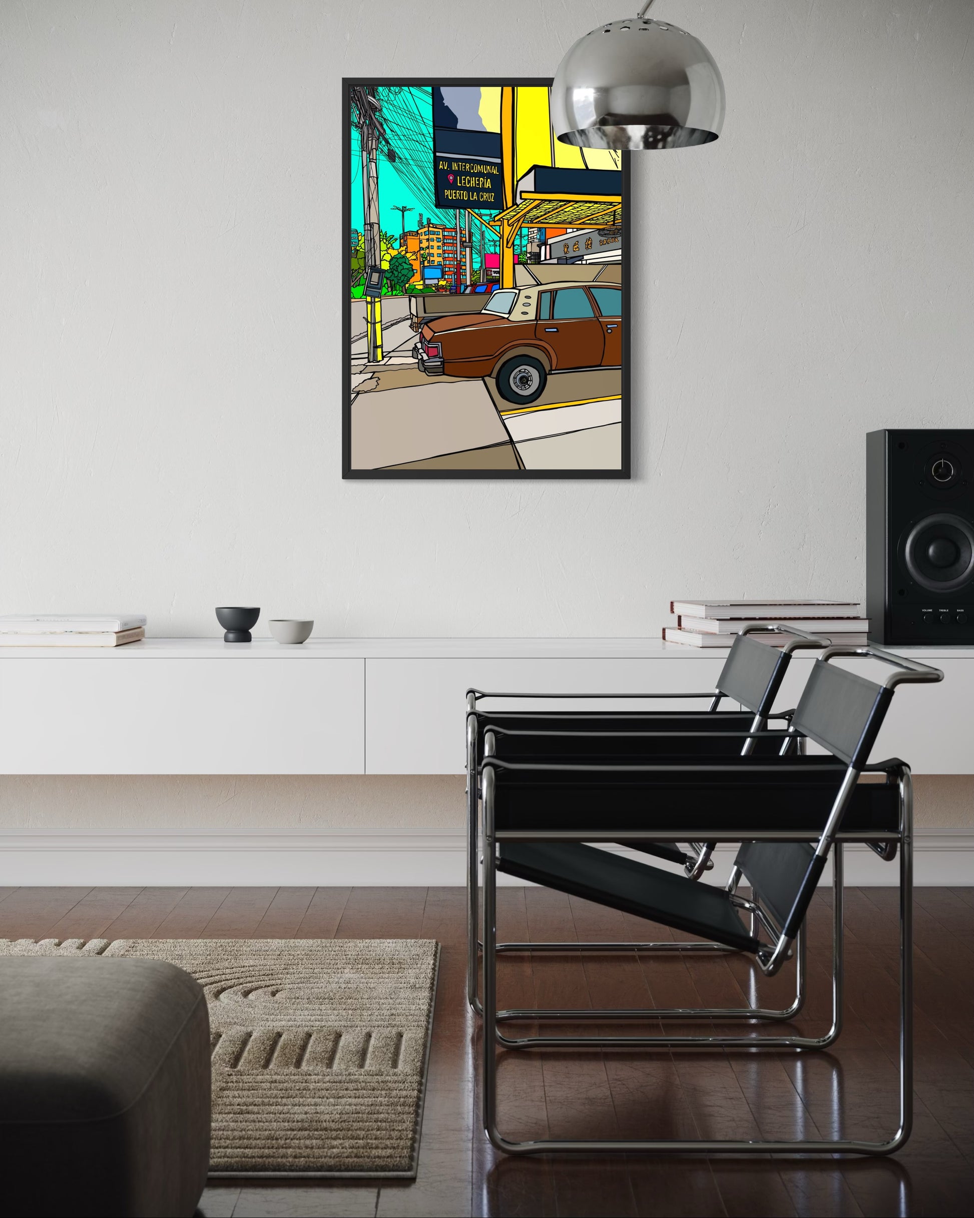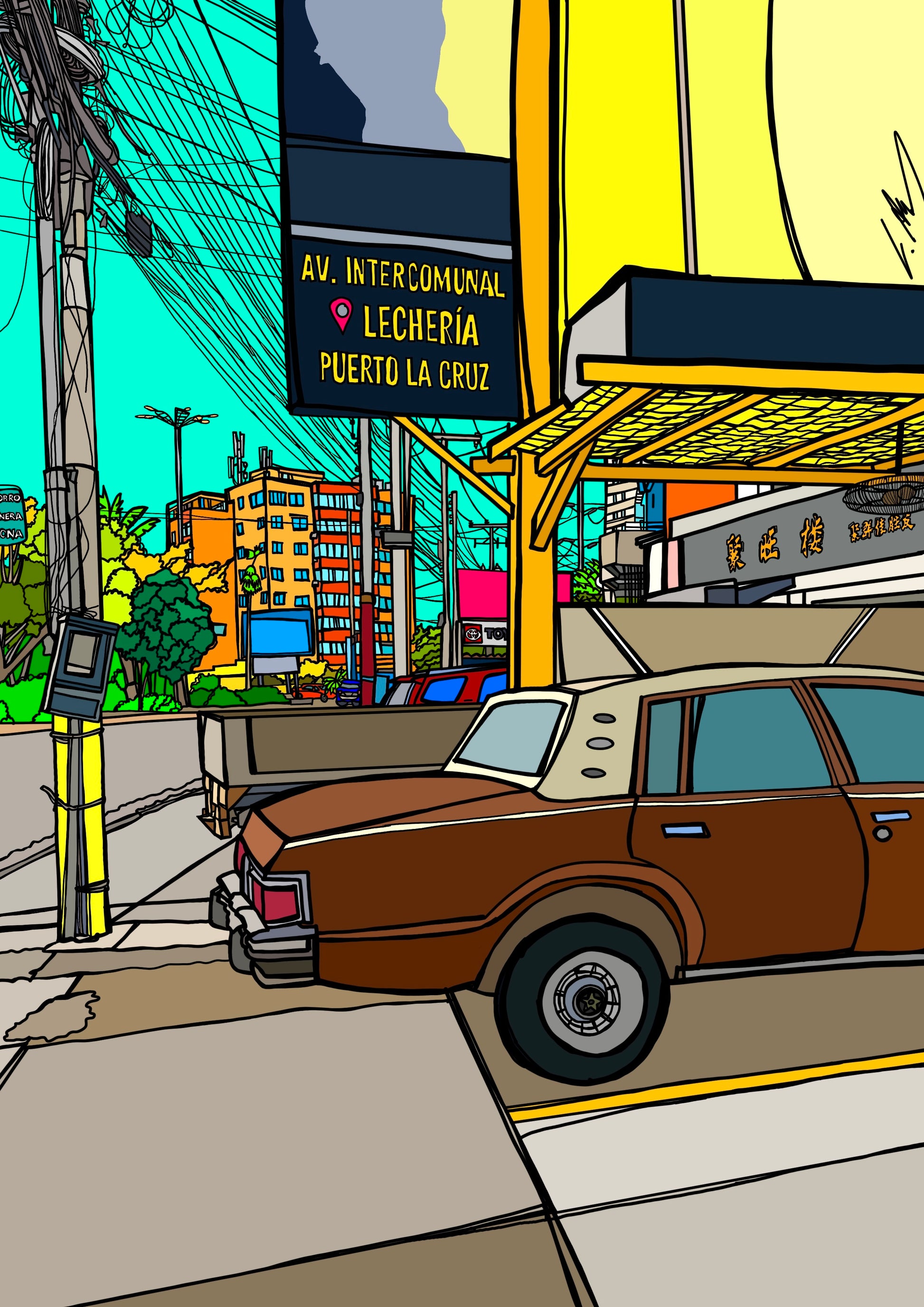 In this print, Avenida Comunal in Lechería becomes a lively snapshot of city life. A vintage car in the foreground, warm orange buildings, and the turquoise sky capture the atmosphere of this street, which the artist walked along almost daily. The many cables above the houses give the work an authentic Latin American flair, while the vibrant colors convey the energy, warmth, and liveliness of the people, all rendered in her distinctive comic style.