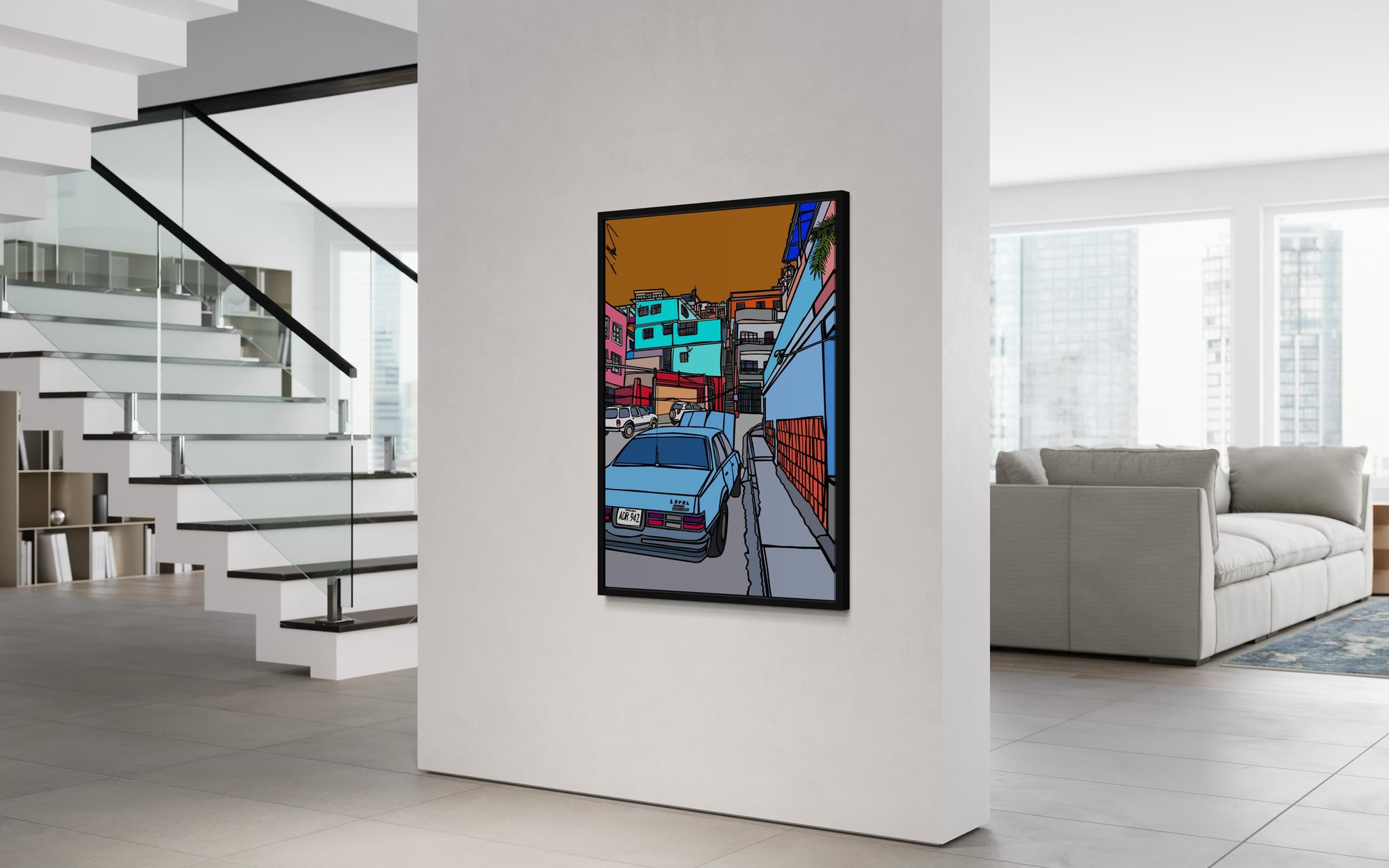 In this colorful work, the Petare neighborhood in Caracas comes to life: turquoise and pink tones of the houses, a light blue vintage car in the foreground, and the nostalgic brown sky reflect the typical character of the barrios. Despite challenging circumstances, the artist experienced the warmth of the people there, captured in her distinctive comic style.
