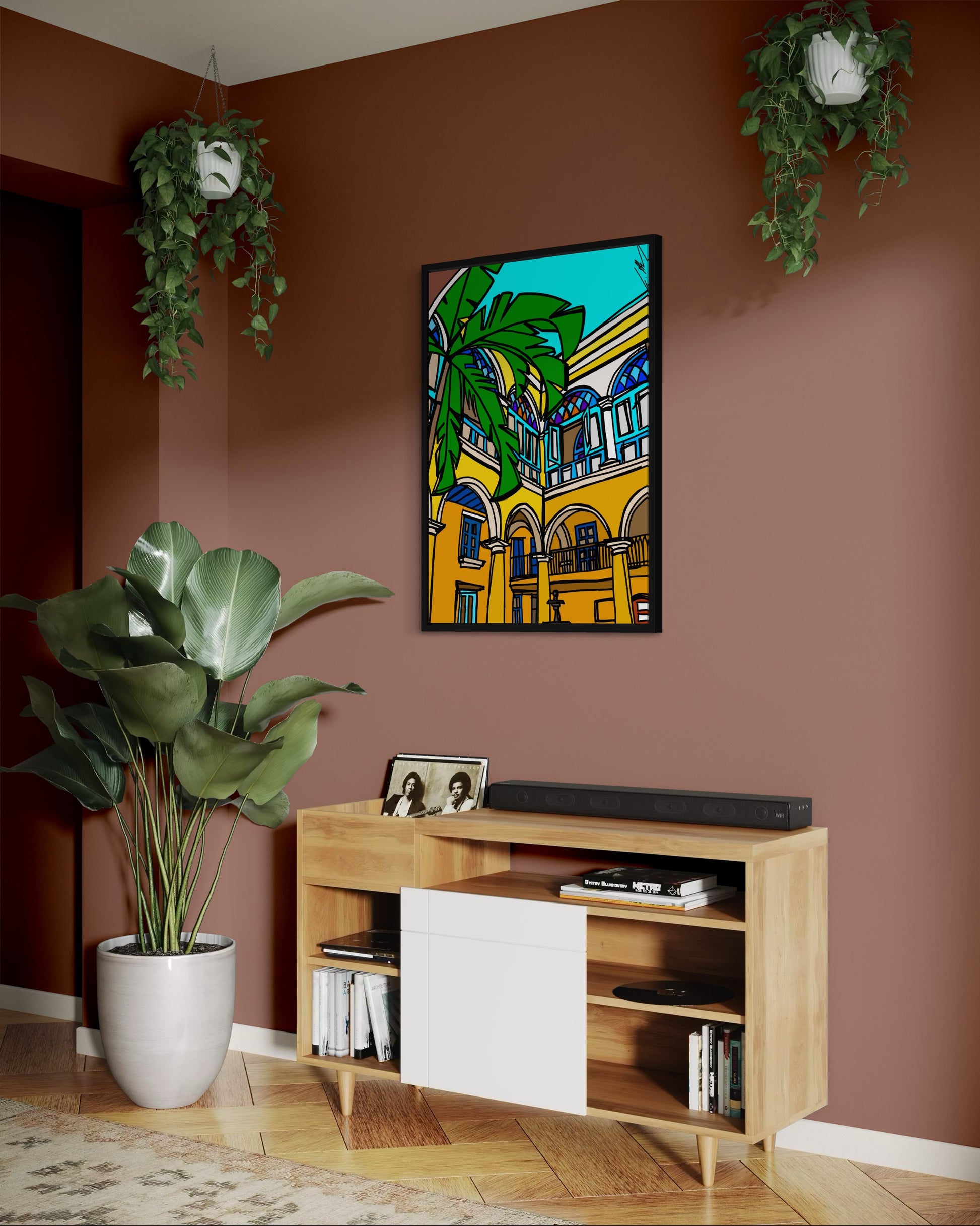 In this print, the artist captures the unmistakable charm of Cuba in her distinctive comic style. The colonial houses glow in vivid yellow tones, while the window frames and sky shine in warm turquoise. The large palm in the foreground enhances the tropical atmosphere, and the bright colors reflect the warmth, joy of life, and friendliness of the Cuban people.