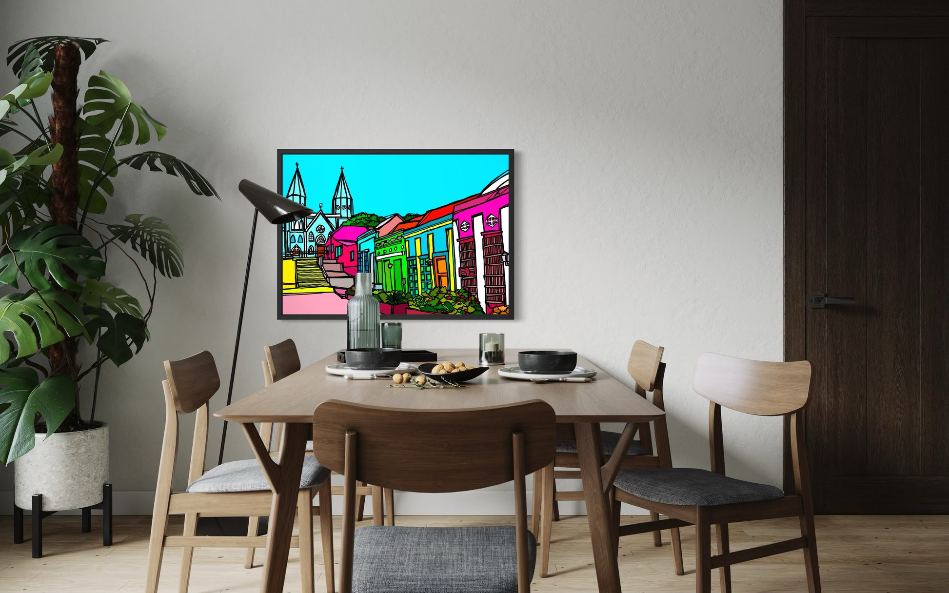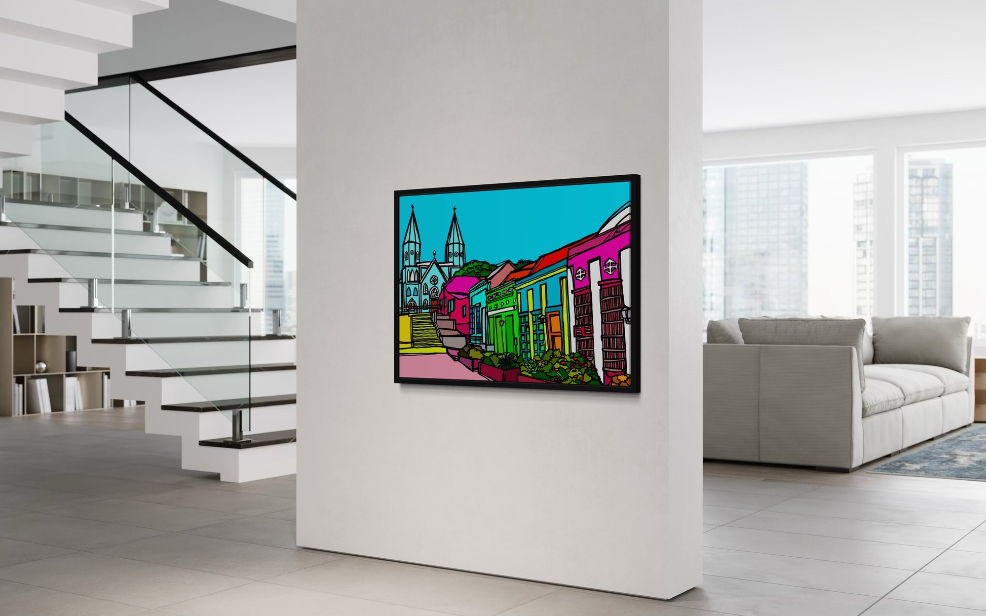 In this colorful print, Claudia Ahrens captures the joy of life in Maracaibo. The vibrant houses, the turquoise-blue sky, and the Iglesia Santa Lucia at the end of the street reflect the alegría, spirit, and energy of the people of this city in bright colors and her distinctive comic style.