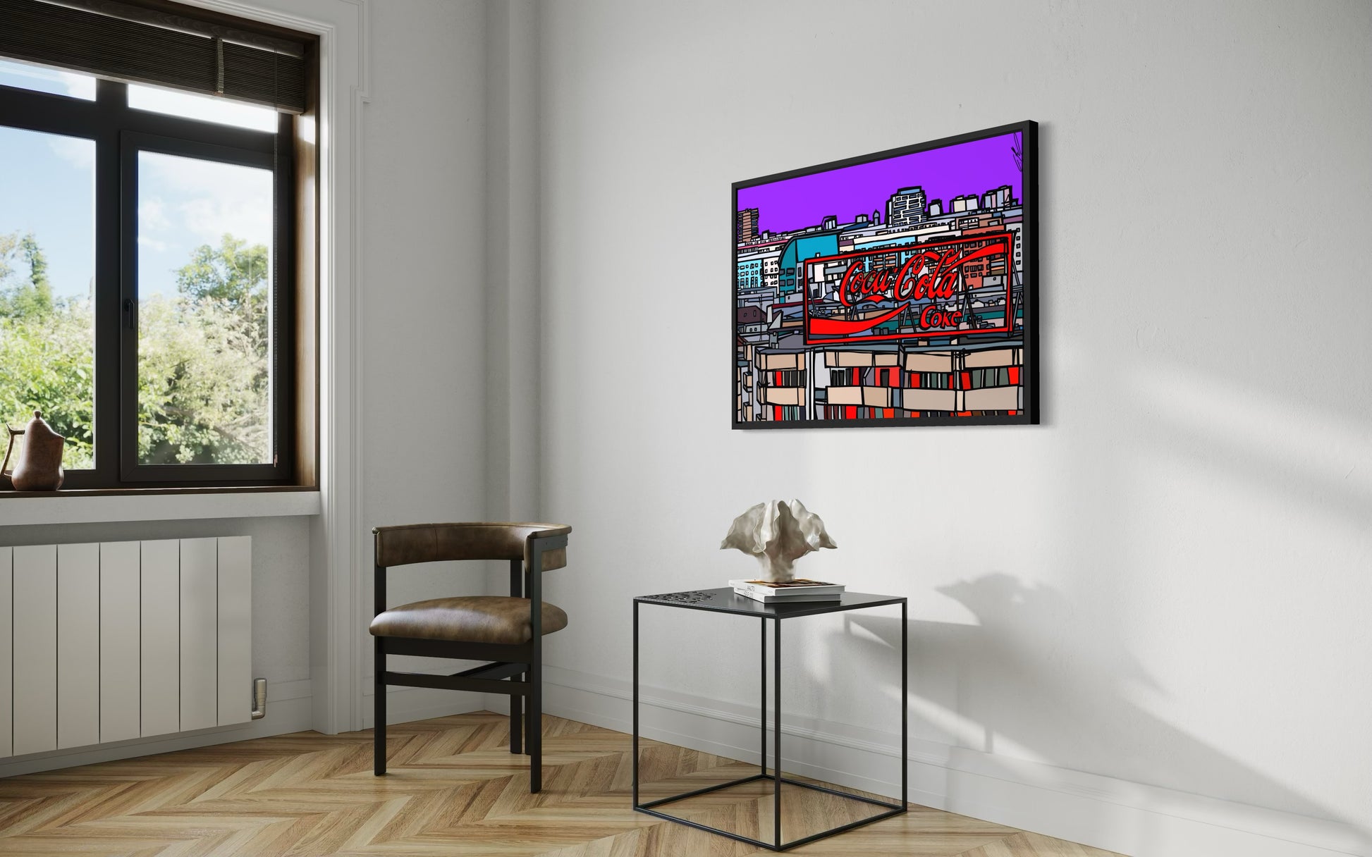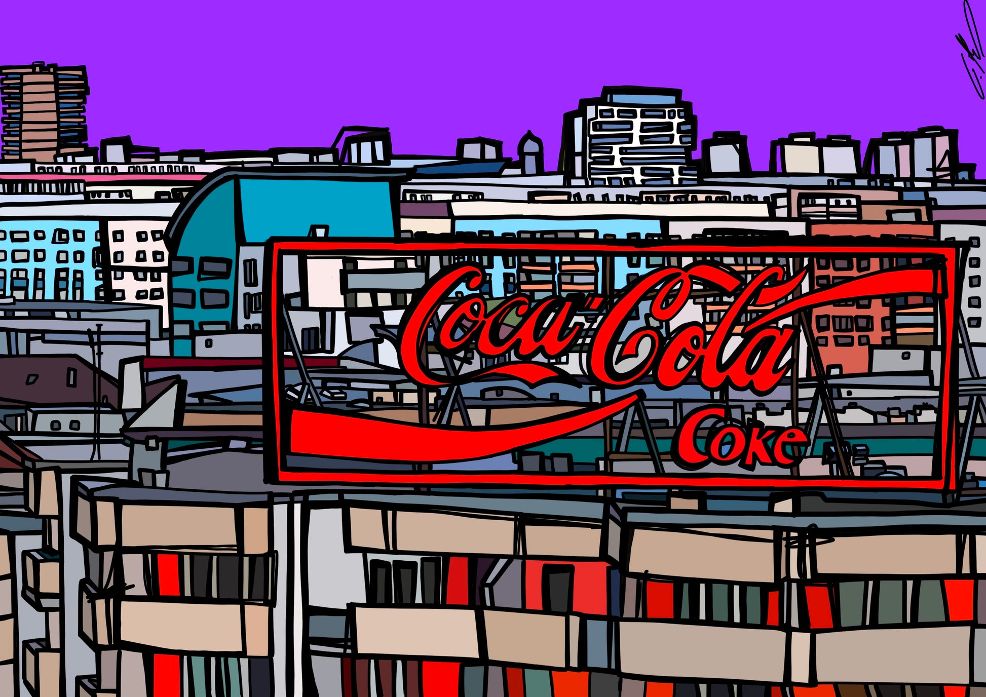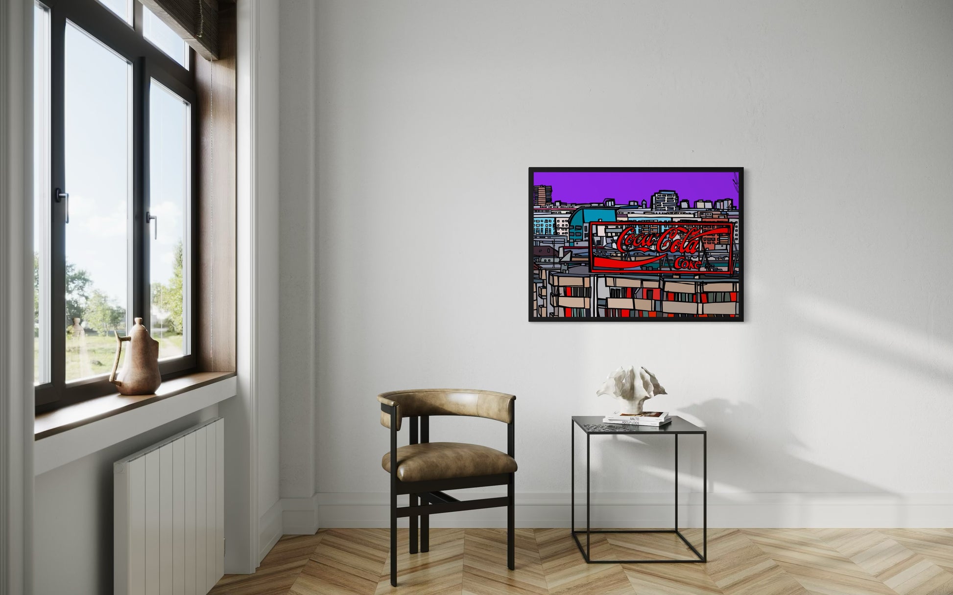 The artist captured the Spitteleck in Berlin in her distinctive comic style: the iconic Coca-Cola sign glows in vivid red under an intense purple sky, capturing Berlin’s wild and eccentric pulse. For the artist, the sign is more than an advertising logo; it symbolizes history, shortly after Germany’s reunification in 1991.
