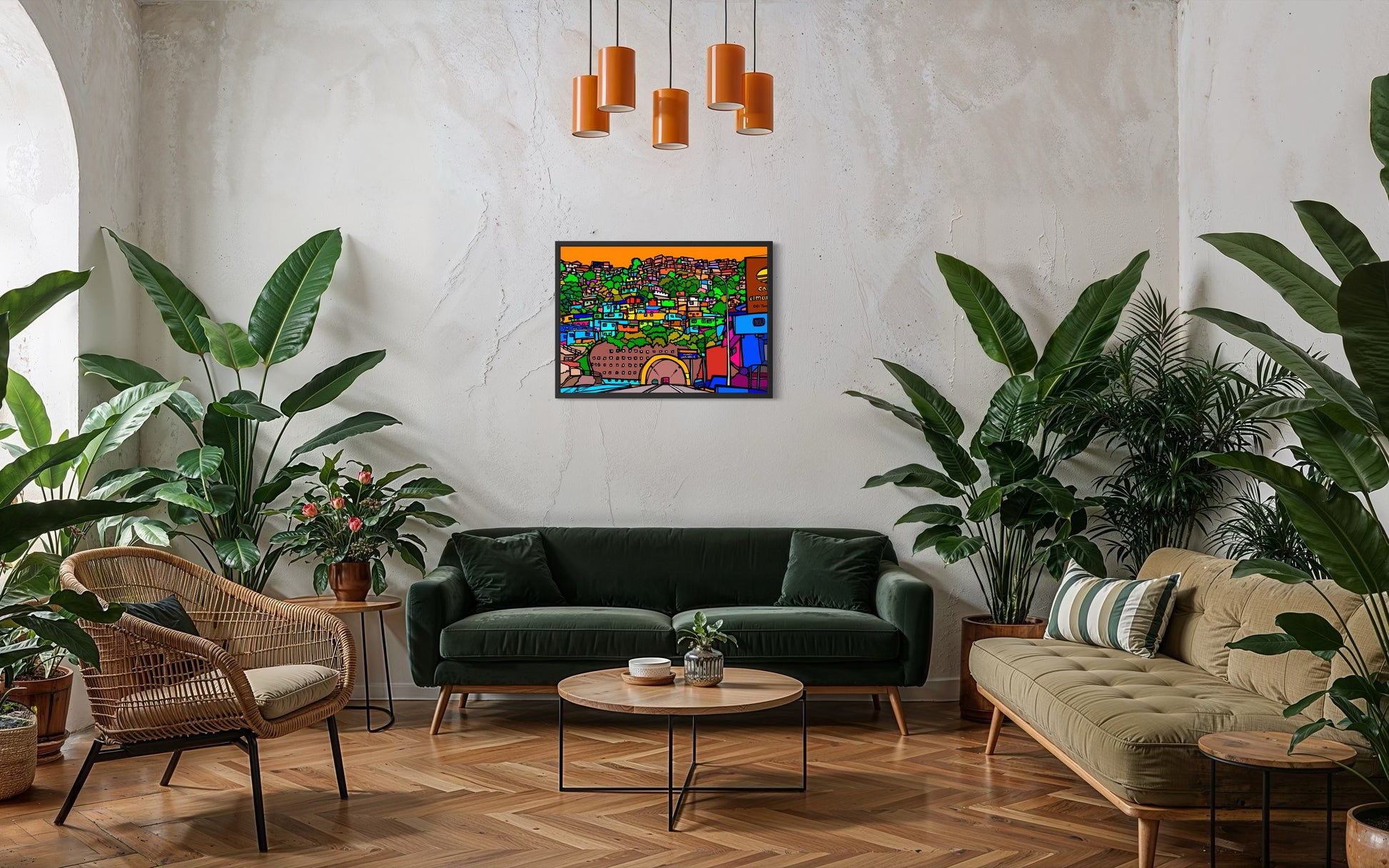 The La Planicie Tunnel in Caracas is depicted in this print as an impressive snapshot of city life. Above the tunnel rise the houses of the barrio, brightly colored and full of energy. Despite often challenging living conditions, the vibrant colors convey the joy of life and resilience of the people who live here. The work captures this special atmosphere in a lively, colorful comic style.