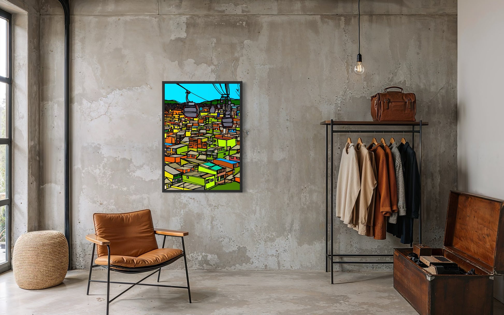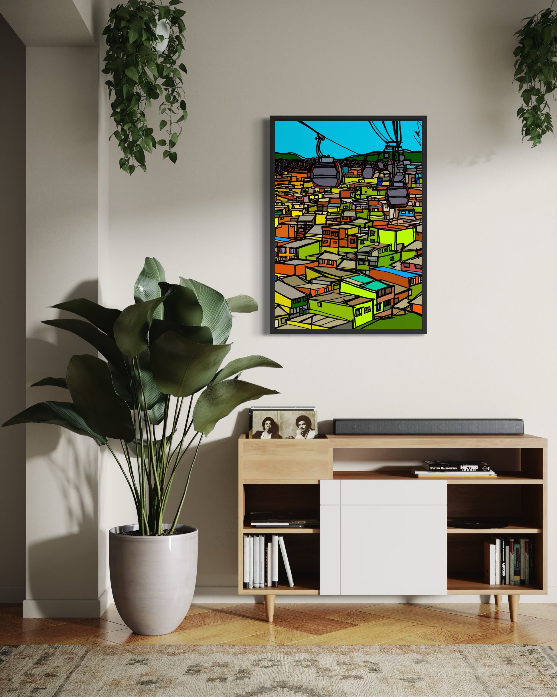 This print by Claudia Ahrens depicts the Ciudad Bolívar neighborhood in Bogotá from a bird’s-eye view. From the perspective of the TransMiCable gondola over the hills, a sea of green, yellow, and orange houses unfolds. Despite all challenges, the streets and rooftops radiate strength, hope, and the creative energy of the people. The artist captures this vibrant atmosphere in her distinctive comic style, full of bright colors and intricate details.
