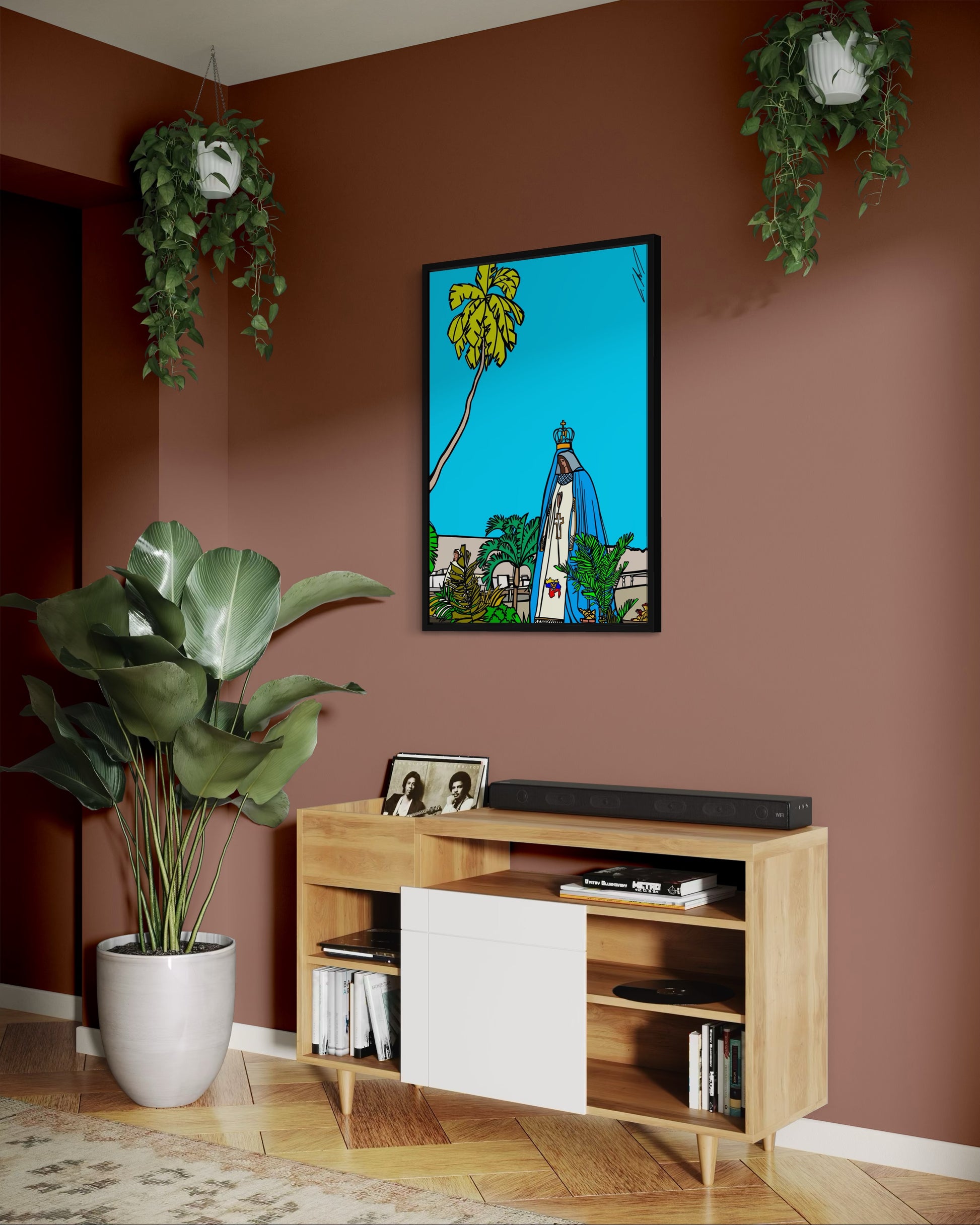 During her seven-month stay in Lechería, Venezuela, Claudia Ahrens developed a small daily ritual: walking along Playa Lido. Time and again, she passed the statue of the Virgen del Valle, a quiet yet powerful guardian between palms, sand, and sea. Her serenity and strength inspired the artist to create this piece: a vividly colored portrait of feminine energy, rendered in her signature comic style.
